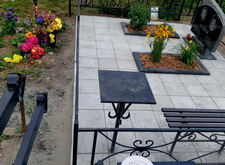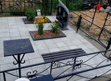 Изначальное состояние места захоронения – отсыпанный песком участок. Клиентку не устраивало подобное наземное покрытие: сложное в уборке и не очень привлекательное внешне. Заказчица пожелала заложить могилу бетонной плиткой, сохранив два цветника.